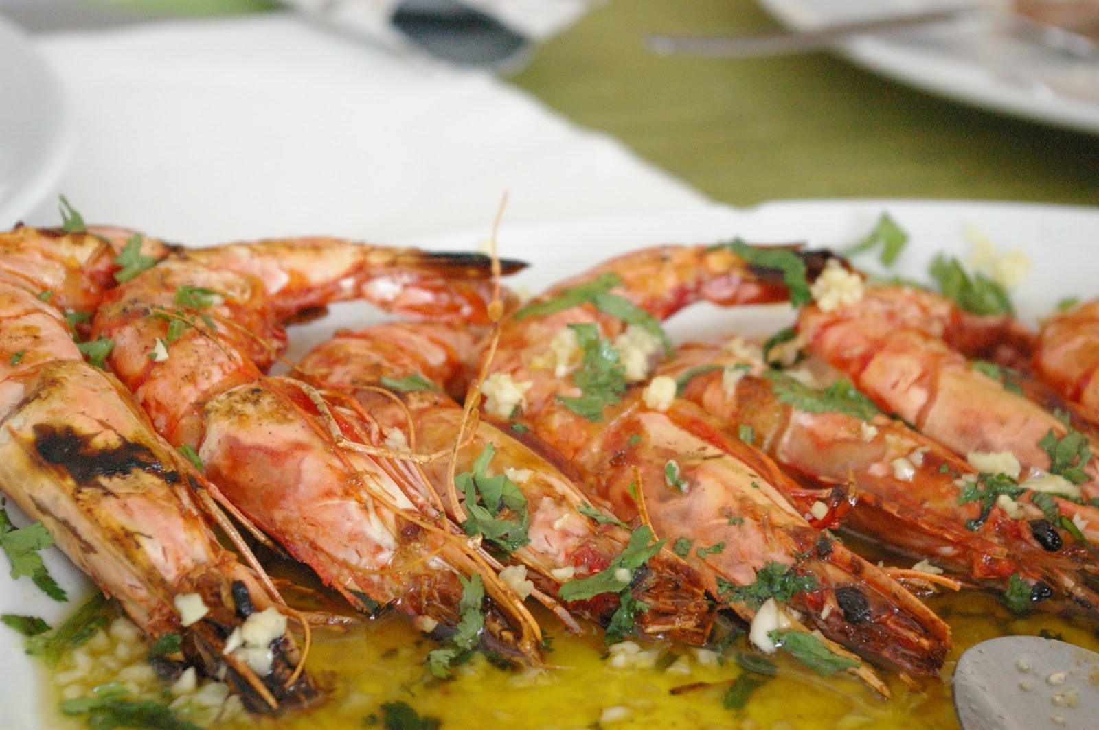 Estas são as Gambas grelhadas à Dona Bia que vêm acompanhadas por um ex-ce-len-te arroz de coentros! Já o tinhámos provado na véspera juntamente com filetes de peixe-galo e rendemo-nos. É tão, mas tão bom...